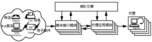 媒體交互模塊是跨媒體隊(duì)列結(jié)構(gòu)的通信入口。聯(lián)系中心所使用的每一種類(lèi)型的媒體信道都與不同的模塊相關(guān)聯(lián),這些模塊檢測(cè)不同各自信道上的用戶(hù)請(qǐng)求,并將他們轉(zhuǎn)交給該隊(duì)列引擎。