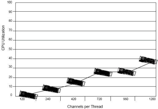 基于1200通道, Dialogic工程師測試了每個線程不同的通道數(shù)(例如每個線程120端口和240端口). 測試結(jié)果表明,