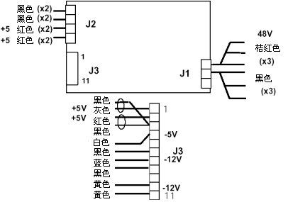 首先要將連接PSU與系統(tǒng)其它部分的電纜拆除。有兩個"鍬型連接點端"和一個"螺絲型連接端"連接器模塊,它們的固定螺絲可以通過PSU蓋的一條縫而觸及。這些連接器上所有電纜都應(yīng)拆除,電纜位置在圖8-1中詳述。將4個固定螺絲除下,將PSU從機箱中抽出。