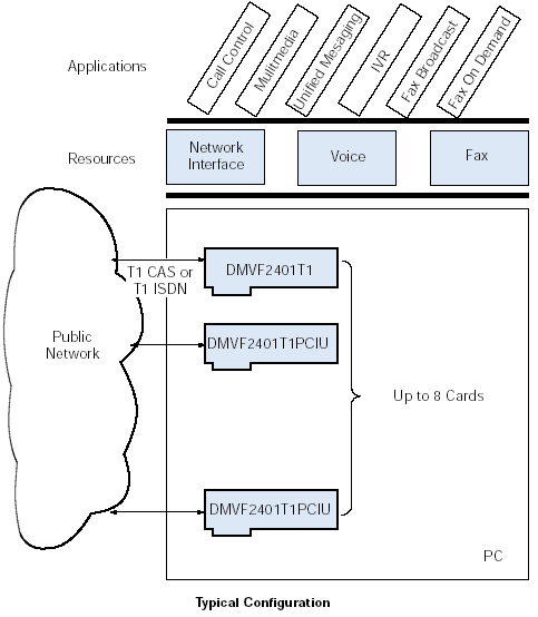 利用DMVF2401TIPCIU以及DMVF3001E1PCIU板卡可以構建復雜的、集成的通訊系統(tǒng)。用戶可以方便的向該系統(tǒng)加入很多功能,比如語音回應、按需傳真、傳真廣播、統(tǒng)一消息以及呼叫控制服務。