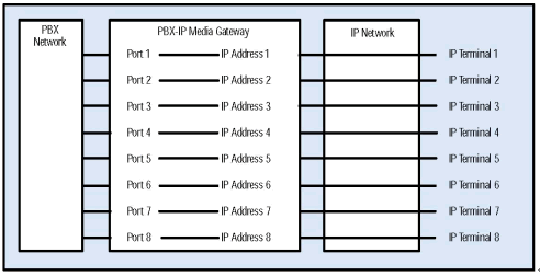 每一個PBX-IP 媒體網(wǎng)關(guān)的 PBX 端口都被設(shè)定了一個相應(yīng)的IP地址, 從PBX某個端口來的PBX網(wǎng)絡(luò)中的呼叫通過IP網(wǎng)絡(luò)被路由到制定的IP地址.